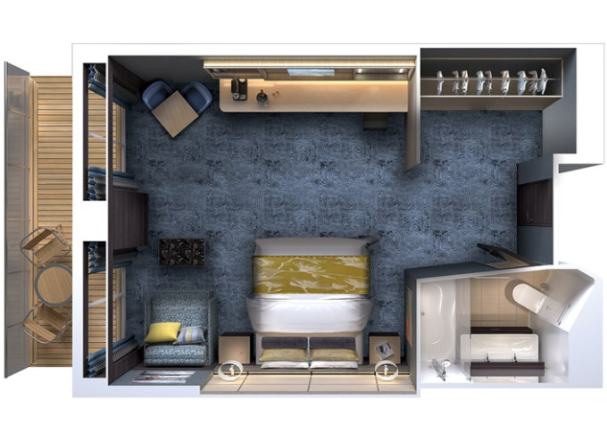 B1 - Kajuta s balkónom Aft-facing od 20 m² / balkón od 3 m². 9. až 15. paluba. Max 2-3 osoby. 5 932 € 2 966 € za osobu