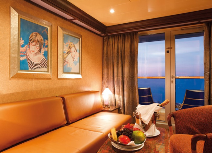 GS - Grand Suite s balkónom 52,3 m² (vrátane balkónu). Max 2-3 osoby. 7. paluba. Cenový model All Inclusive. Výhody Suite. 4 398 € 2 199 € za osobu