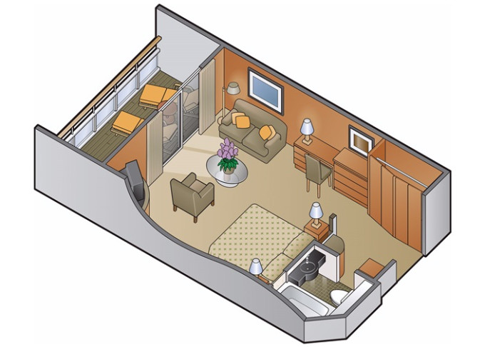 | CS - Celebrity Suite 44 m² + balkón 8 m². Kúpeľňa s vírivkou. 6. až 9. paluba. Max 3 osoby. Výhody Suite The Retreat. | 17 672 € 8 836 € za osobu | ||