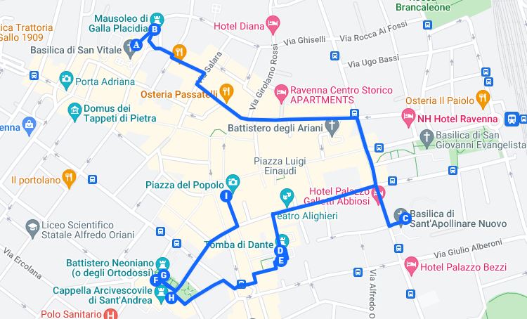 Odporúčaná trasa: Basilica di San Vitale - Mausoleo di Galla Placidia - Basilica di Sant'Apollinare Nuovo - Tomba di Dante (hrobka básnika Danteho Alighieriho) - Basilica di San Francesco - Cattedrale della Risurrezione di Nostro Signore Gesù Cristo - Battistero Neoniano (o degli Ortodossi) - Museo Arcivescovile di Ravenna - Piazza del Popolo